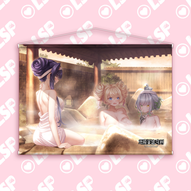 2024年10月发布的《恶魔鉴定守则》的官网预约抽选特典。使用画有3位女主角沐浴形象神秘CG制作的B2横板挂轴1个。